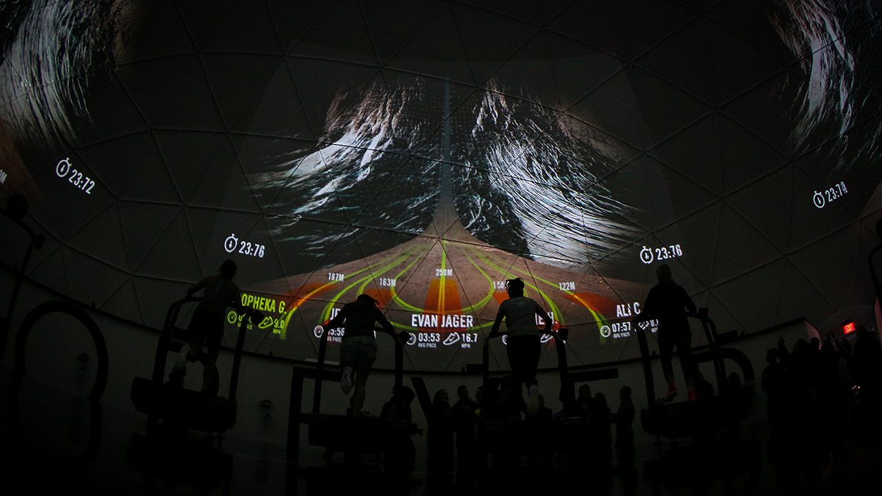 使用Nike Run Club和Lunar鞋类品牌作为展览基地,16名跑步者一次在试验圆顶的360º虚拟环境中参加跑步机比赛。