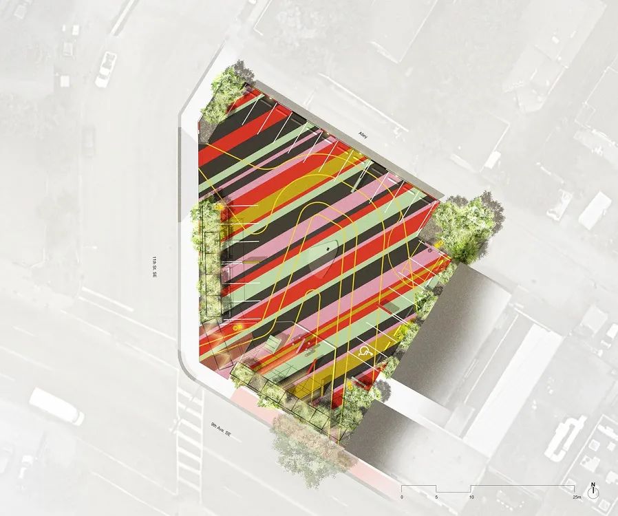 PARK PARK外观仿佛多层次的蛋糕,机能上则是个停车场公园(parking lot park),里头允许多采多姿和充满尝试性的活动共存。设计团队之所以打造一种混合使用态样,乃是基于创造新意义,同时也开启都会停车场在机能定位上的可能性,就像加拿大卡加利市(Calgary)流露文艺气息的古老街区英格尔伍德(Inglewood)那般。
