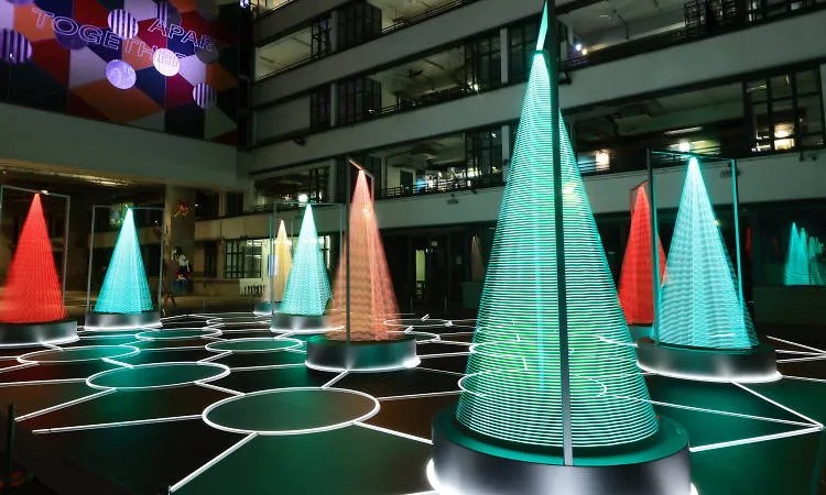 香港中环的PMQ与香港设计团队littleurbanmountain合作,设计出「Merry Apart ChristmasTogether」圣诞装置。圣诞装置以八棵简约造型的圣诞树组成,每棵彼此相隔一米距离。简约的造型,8棵圣诞树透过自转转动,产生立体的视觉效果,每到晚上,树上的灯光会亮起,大家可以在梦幻流光的圣诞氛围中,让人重新审视「距离」与人的连接,既然圣诞是个分享爱的节日,就让大家用「距离感」来庆祝,也是疫情期间「爱」的表达。设计团队于地下图案及圣诞树,用上橙、绿、黄、蓝色等大量缤纷颜色,希望装置于困难时刻给大家不一样的开心及希望感觉,于节日期间挥走心中那点点灰暗情绪。