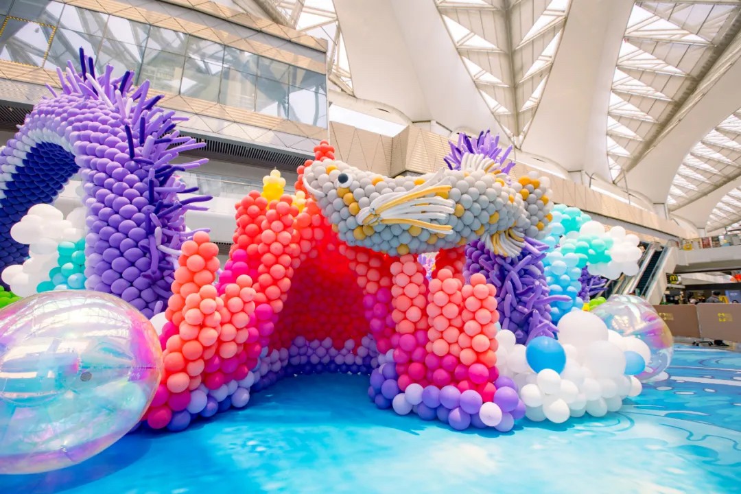 龙在中华民族传统文化中,既是被赋予了神圣意义的符号,又是承载了光明愿景美好向往。五一飞进商都的这条“祈愿神龙”,既给人以壮观威严之大气,又透出一丝优哉游哉畅游一方天地的闲适,正如终于可以卸下一身疲惫,肆意放空5天的人,在华发商都优哉游哉,吃喝玩乐、拍照打卡,做自己的King & Queen!长达24米,最高处达6.5米的龙身横贯B馆中庭,以蛟龙出海之姿迎接各方宾客。在龙身之下穿梭遨游,仿佛置身童话故事中的龙宫,悠游于随波飘摇的五彩珊瑚间,观赏各种鱼儿悠闲地吐着泡泡。置身龙宫的你,除了能一睹龙王风采,还能与刚刚出壳的小幼龙、呆萌的螃蟹、海龟、章鱼……亲密对话。穿越腾云驾雾的金龙拱门,让神龙为你的商都之行,保驾护航。